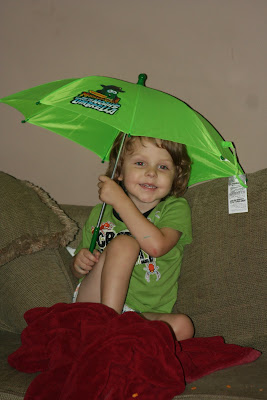No, we don't have an indoor leak, and at the time this picture was taken we had no rain nor none in the forecast. But when we went to the new Lifeway Store (or the library as Gavin so sweetly put it) he found this green umbrella and HAD to have it. Actually he wanted 2 but I had to draw the line somewhere!